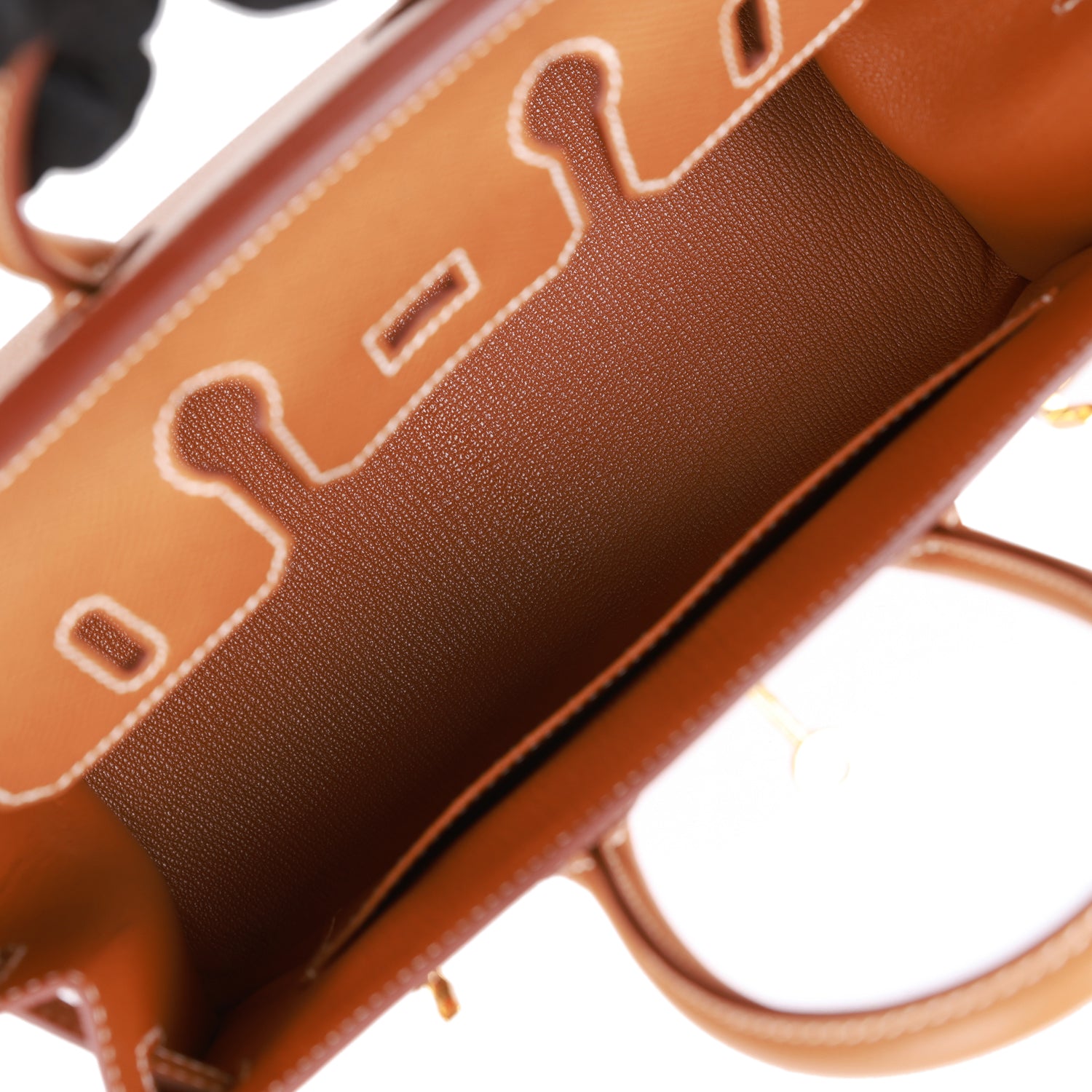The interior is lined with gold chevre and has one zip pocket with an Hermes engraved zipper pull and an open pocket on the opposite side.
