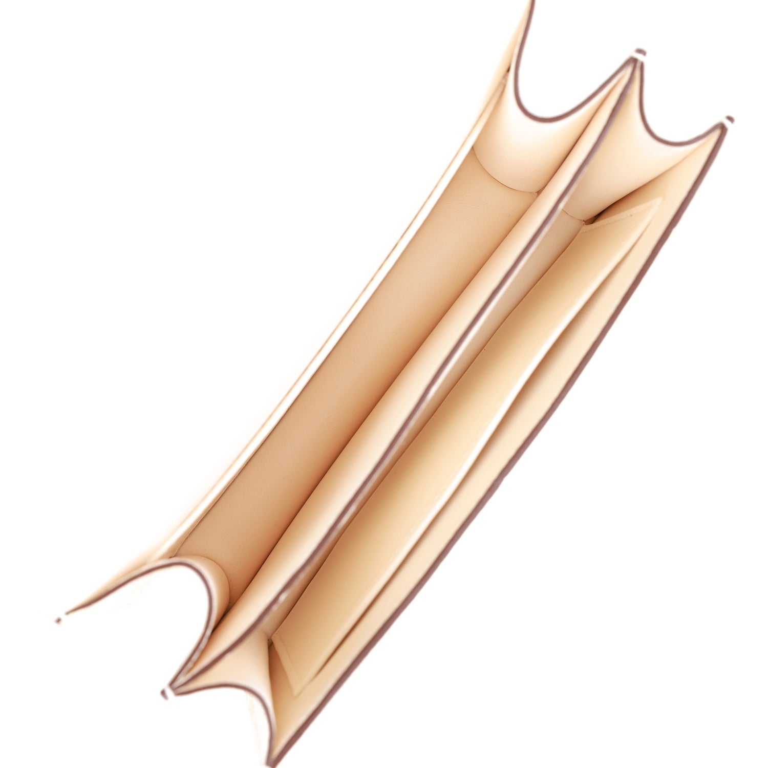 The interior is lined with Nata lambskin and has an open pocket on the front wall, a center divide, and a slit pocket on the back wall.