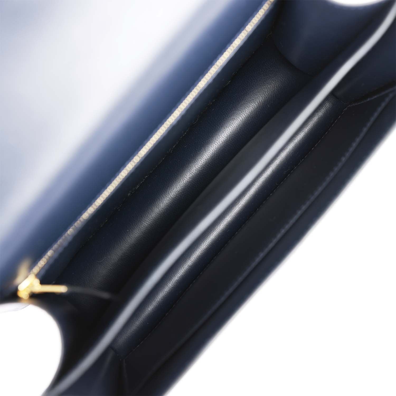 The interior is lined with?Bleu Nuit lambskin leather and has a zip pocket with an Hermes engraved pull.
