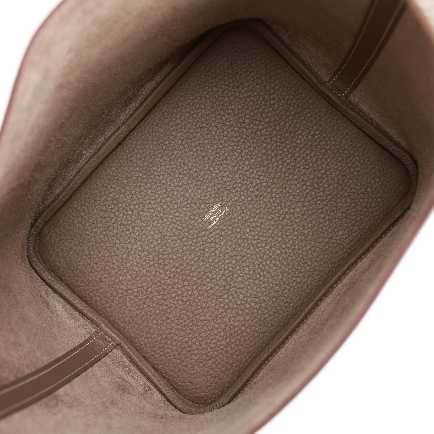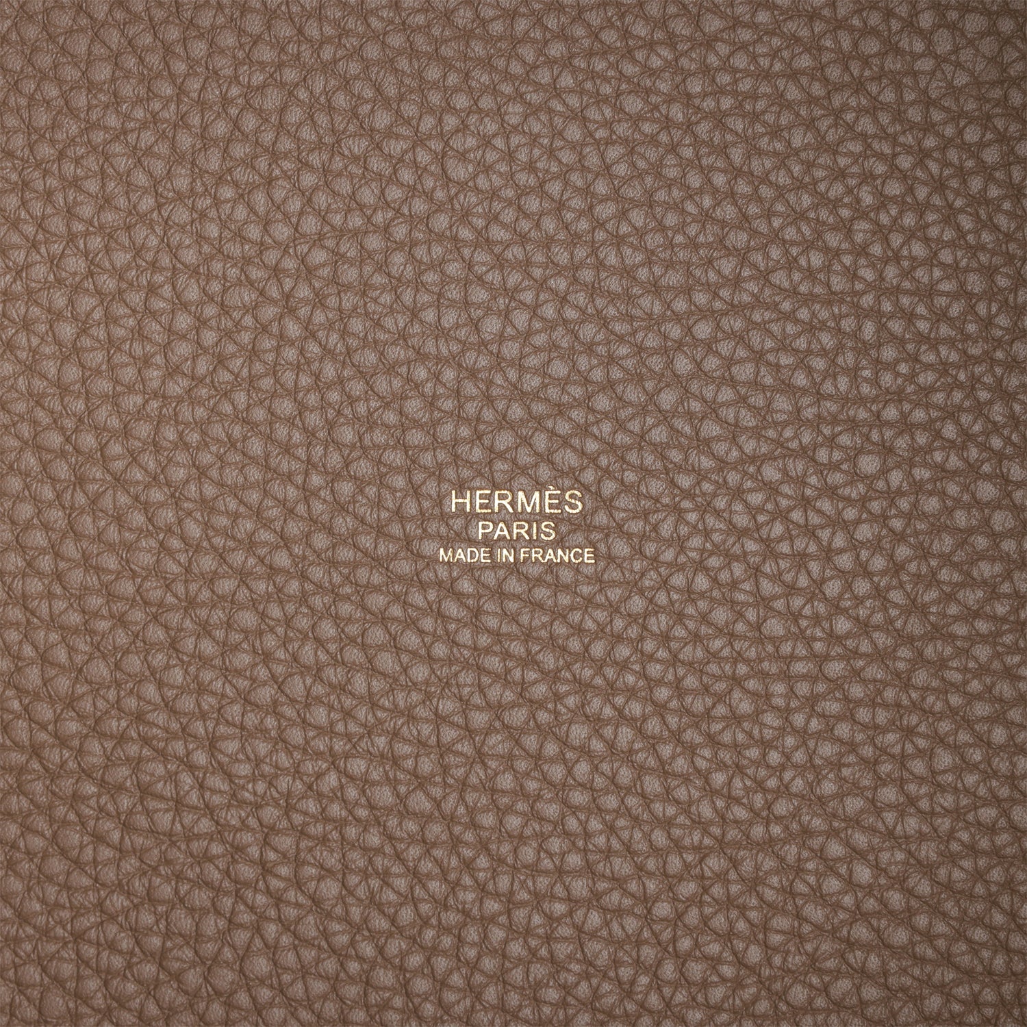 This Picotin is in Etoupe clemence leather with gold hardware and has contrast stitching with two top handles.